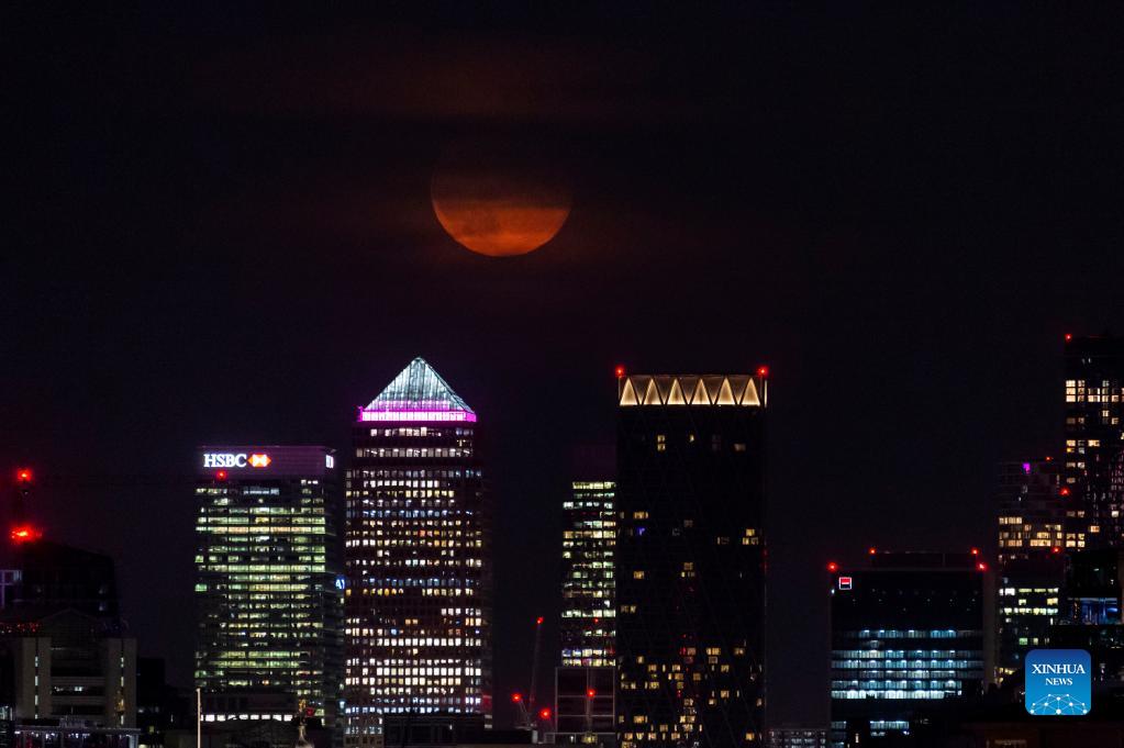 Photo taken on Sept. 21, 2021 shows the full moon rising over Canary Wharf in London, Britain. (Photo by Stephen Chung/Xinhua)