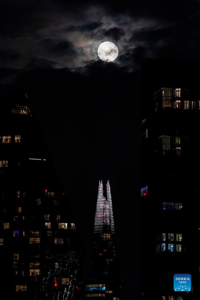 Photo taken on Sept. 21, 2021 shows the full moon rising over the Shard in London, Britain. (Photo by Stephen Chung/Xinhua)