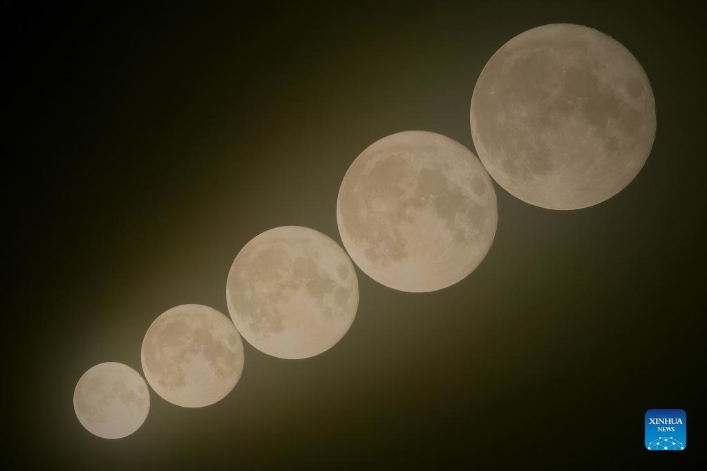 This multiple-exposure photo taken on Sept. 21, 2021 shows a full moon in Brussels, Belgium. (Xinhua/Zhang Cheng)