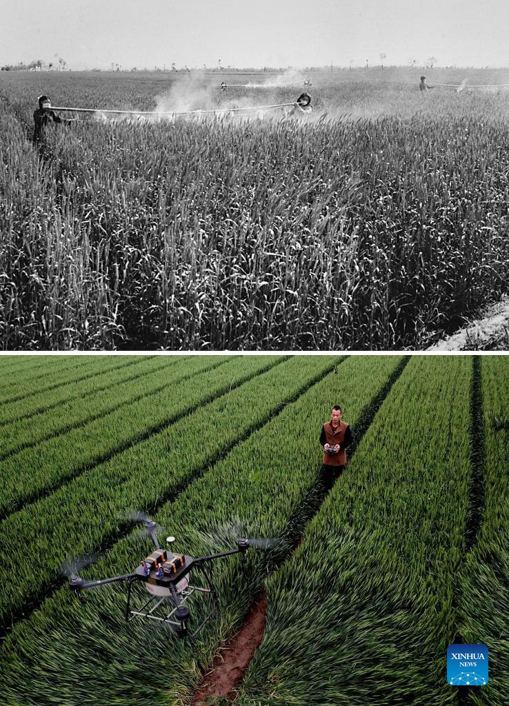 Combo photo shows people applying pesticide with a hand-made simple device in the suburb of Luoyang City in the 1950s (top, photo taken by Yang Zhenhe), and a staff member controlling an UAV (unmanned aerial vehicle) to spray pesticide in Wude Town of Wenxian County on April 25, 2018 (aerial photo taken by Li An), in central China's Henan Province. Henan is an important province for agricultural production in China. Since the founding of the People's Republic of China in 1949, especially during the 40-plus years of reform and opening-up, mechanized and hi-tech farming has helped improve the quality and efficiency of agricultural business there. To date, an increasing number of farmers there are embracing advanced agricultural equipment and management process, bidding farewell to traditional arduous means of agricultural operation. (Xinhua)