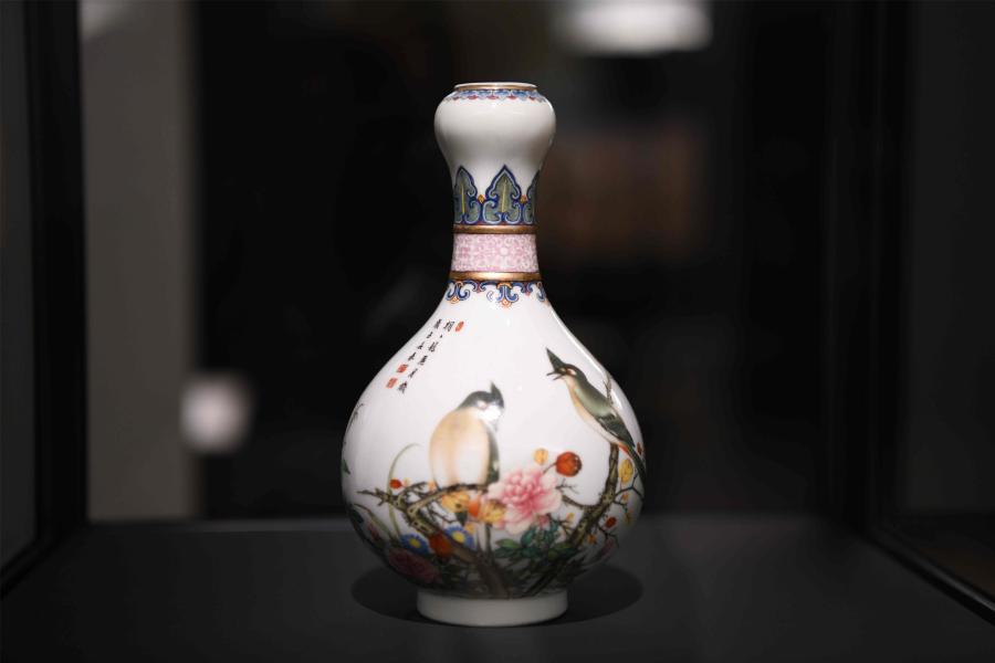 A porcelain collection made in the reign of Emperor Qianlong (1736-1799 A.D.) from China's Qing Dynasty (1636-1912) is on display in the Louvre in Paris, Sept. 22, 2021. (Photo: China News Service/Li Yang)