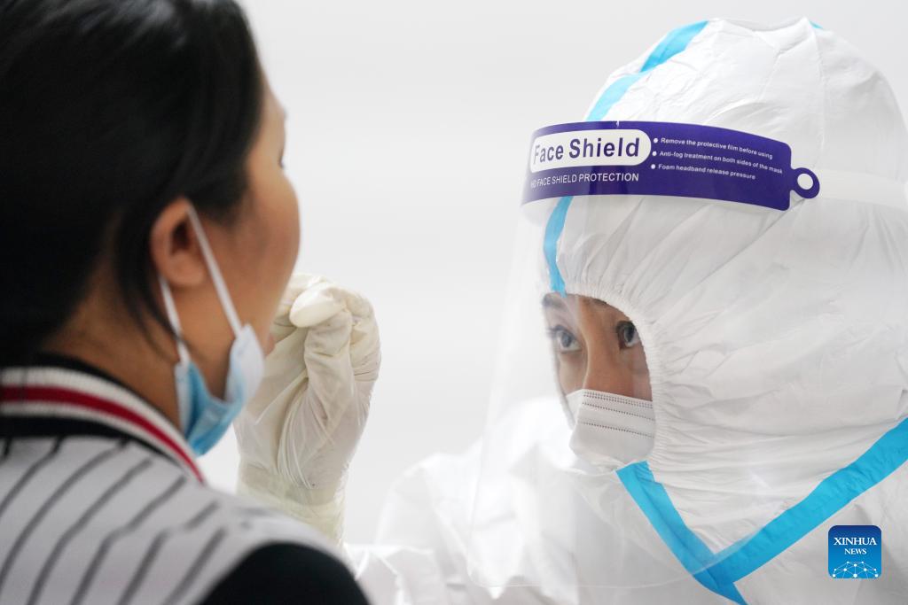 A resident receives a nucleic acid test at a testing point in Nangang District of Harbin, northeast China's Heilongjiang Province, Sept. 22, 2021. Harbin, capital of northeast China's Heilongjiang Province, with a population of more than 10 million, launched citywide nucleic acid testing on Tuesday afternoon and plans to complete the campaign by the end of Thursday, the city's COVID-19 prevention and control headquarters said. Heilongjiang Province had reported eight confirmed locally transmitted COVID-19 cases by Wednesday noon, all in Harbin, the provincial health commission said. (Xinhua/Wang Jianwei)