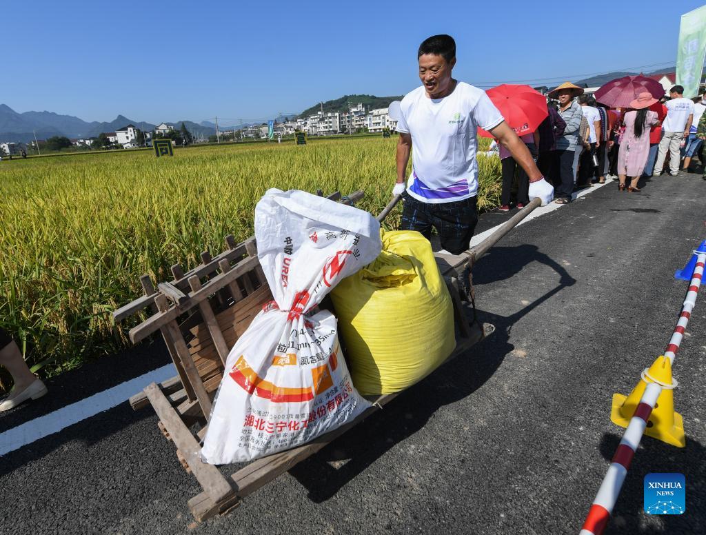 A farmer participates in a wheelbarrow race in Datong Township of Jiande, east China's Zhejiang Province, Sept. 22, 2021. A sports event themed on paddy field was held in Datong on Wednesday. The games included rice harvesting, wheelbarrow race, rice-carrying relay and tug of war. (Xinhua/Xu Yu)