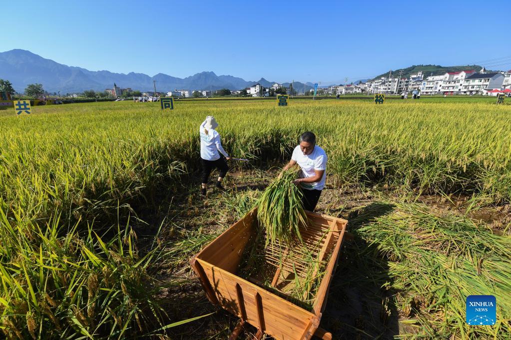 Farmers participate in a rice harvesting game in Datong Township of Jiande, east China's Zhejiang Province, Sept. 22, 2021. A sports event themed on paddy field was held in Datong on Wednesday. The games included rice harvesting, wheelbarrow race, rice-carrying relay and tug of war. (Xinhua/Xu Yu)