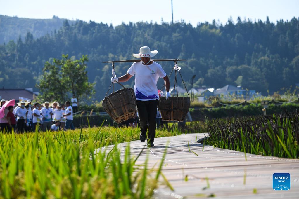 A farmer participates in a rice-carrying relay game in Datong Township of Jiande, east China's Zhejiang Province, Sept. 22, 2021. A sports event themed on paddy field was held in Datong on Wednesday. The games included rice harvesting, wheelbarrow race, rice-carrying relay and tug of war. (Xinhua/Xu Yu)