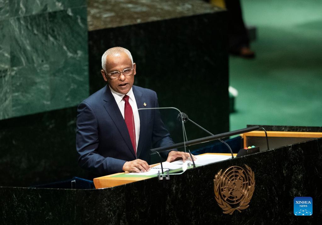 Maldivian President Ibrahim Mohamed Solih addresses the general debate of the 76th session of the United Nations General Assembly at the UN headquarters in New York, Sept. 21, 2021. The General Debate of the 76th session of the United Nations General Assembly kicked off on Tuesday. (Xinhua/Wang Ying)