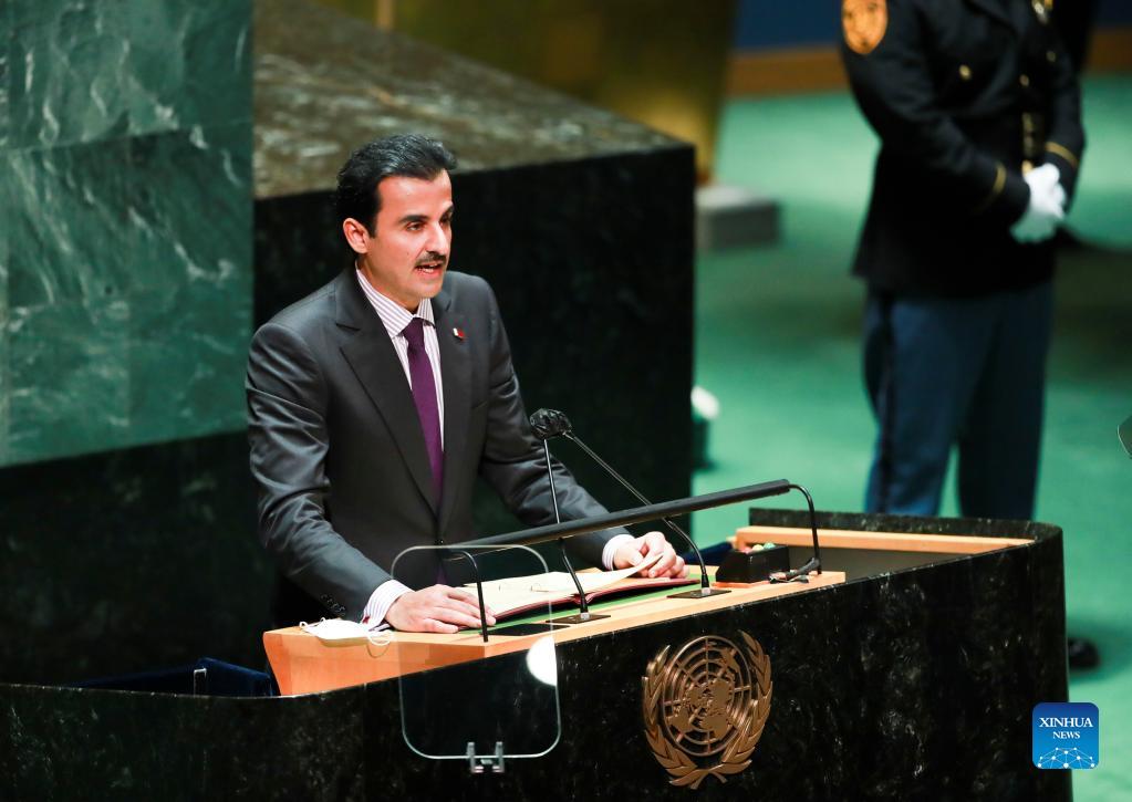 Emir of Qatar Sheikh Tamim bin Hamad Al Thani addresses the general debate of the 76th session of the United Nations General Assembly at the UN headquarters in New York, Sept. 21, 2021. The General Debate of the 76th session of the United Nations General Assembly kicked off on Tuesday. (Xinhua/Wang Ying)