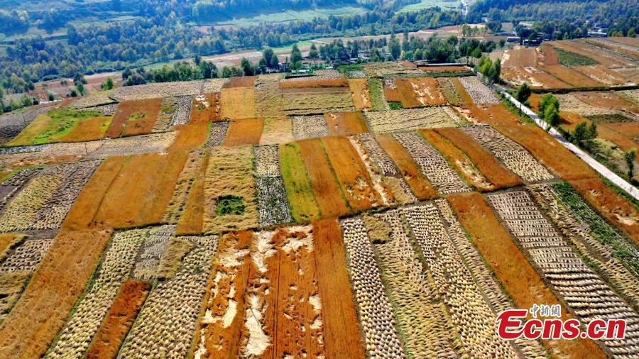 Undated aerial photo shows the colorful fields in autumn resemble an eyeshadow platelet on the plateau of northwest China’s Qinghai Province. (China News Service/Wei Tingxiang)