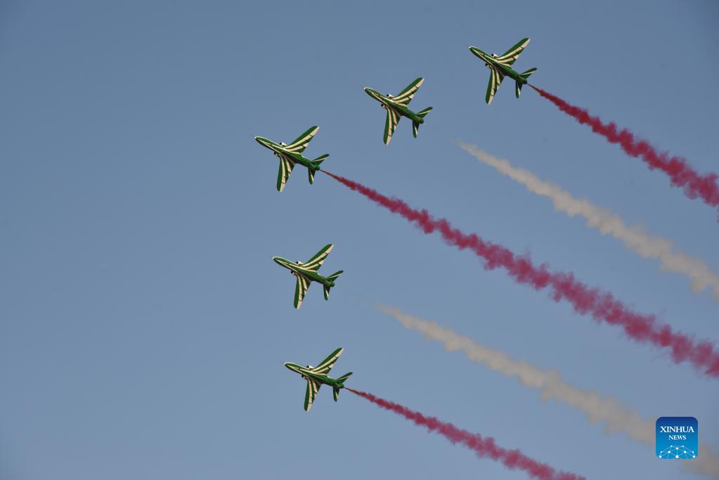 Photo taken on Sept. 22, 2021 shows the Saudi Hawks aerobatics show at the Um Ajlan Park in Riyadh, Saudi Arabia. The airshow was held here on Wednesday and Thursday to celebrate the country's National Day. (Xinhua/Wang Haizhou)