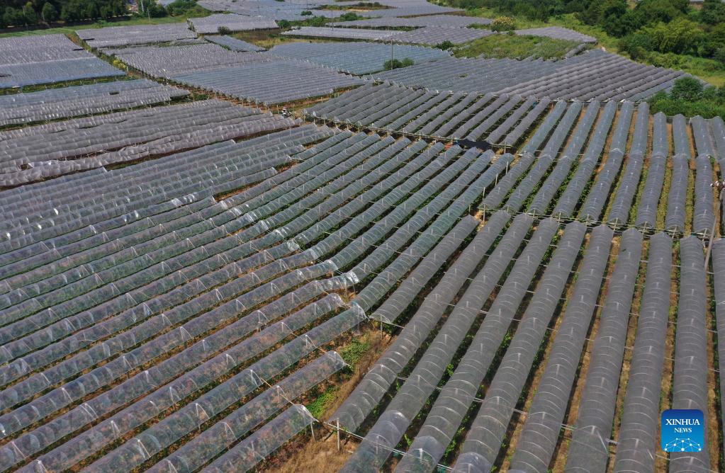 Aerial photo taken on Sept. 23, 2021 shows a grape planting base in Changning City of Hengyang City, central China's Hunan Province. (Xinhua/Zhao Zhongzhi)