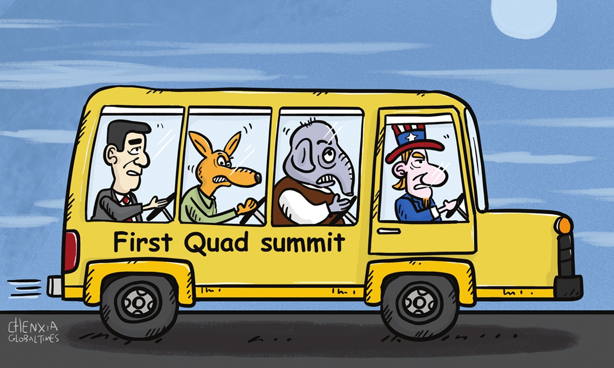 The Quad summit, scheduled to take place on Friday, which will likely mention marine security concerns for the purpose of containing China and demonstrate that the Indo-Pacific is the current strategic center of the US, was at the stage of forging verbal consensus rather than signing substantial deals, Chinese analysts said on Thursday, noting that US typical practice of abandoning its allies like dumping trash in front of its interests will make Quad another NATO which is existing only in name.