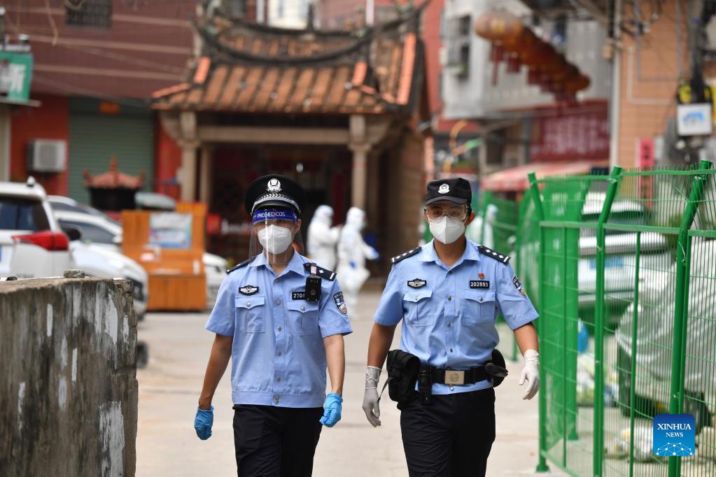 Police offers patrol outside a lock-down area at the Xihu community in Tongan District of Xiamen City, southeast China's Fujian Province, Sept. 23, 2021. Medical workers, public servants, police officers, and volunteers all over Xiamen are mobilized to help Tongan with its COVID-19 prevention and control efforts. Experts under the State Council inter-agency task force for COVID-19 response have arrived at high and medium COVID-19 risk areas in Tongan on Sept. 20 to offer their guidance. (Xinhua/Jiang Kehong)