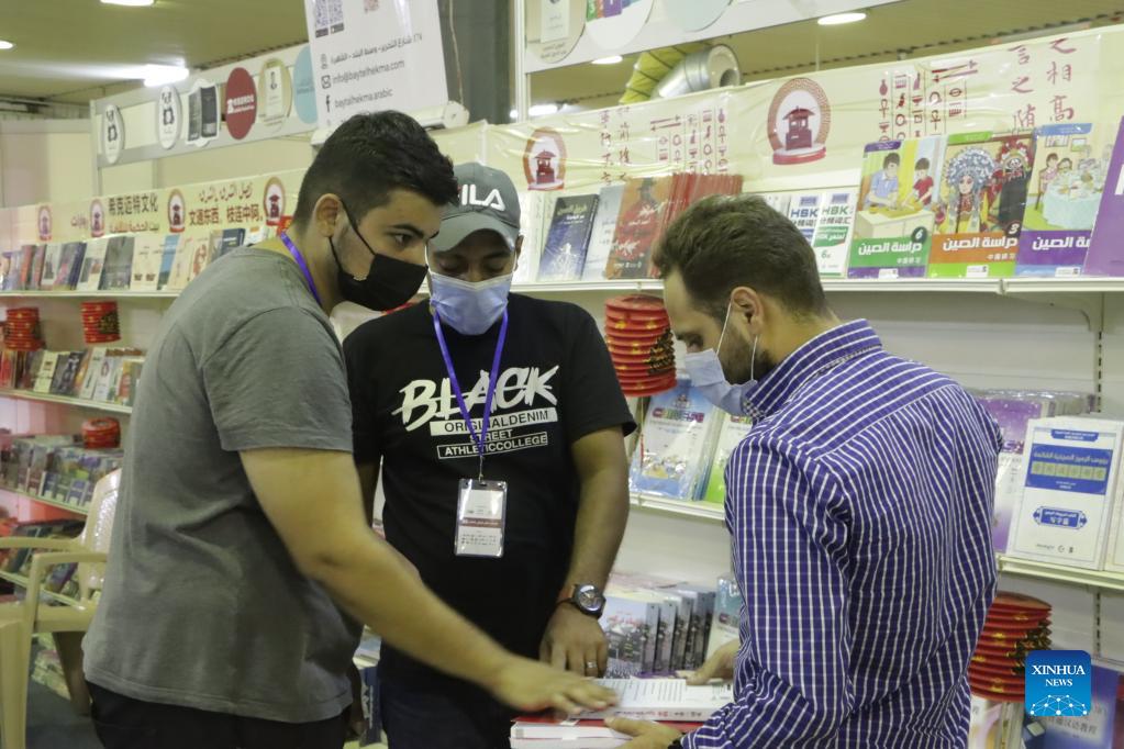 People visit the 20th Amman International Book Fair in Amman, Jordan, on Sept. 23, 2021. The 20th Amman International Book Fair kicked off on Thursday, gathering more than 360 Jordanian and international publishing houses. (Xinhua/Ji Ze)