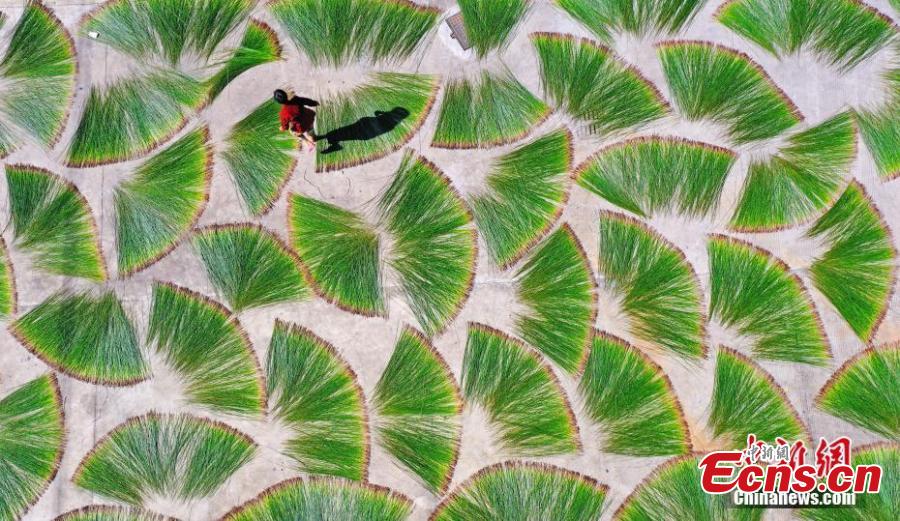 Villagers dry mat grass in Shuanggang Village, Linhai City, Taizhou City, east China’s Zhejiang Province, July 15, 2021. (China News Service/Hua Wenwu)
