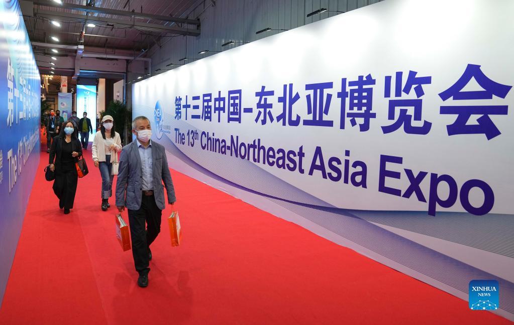 People visit the 13th China-Northeast Asia Expo in Changchun, northeast China's Jilin Province, on Sept. 23, 2021. The 13th China-Northeast Asia Expo is held online and offline from Sept. 23 to 27 in Changchun, capital city of northeast China's Jilin Province. (Xinhua/Xu Chang)
