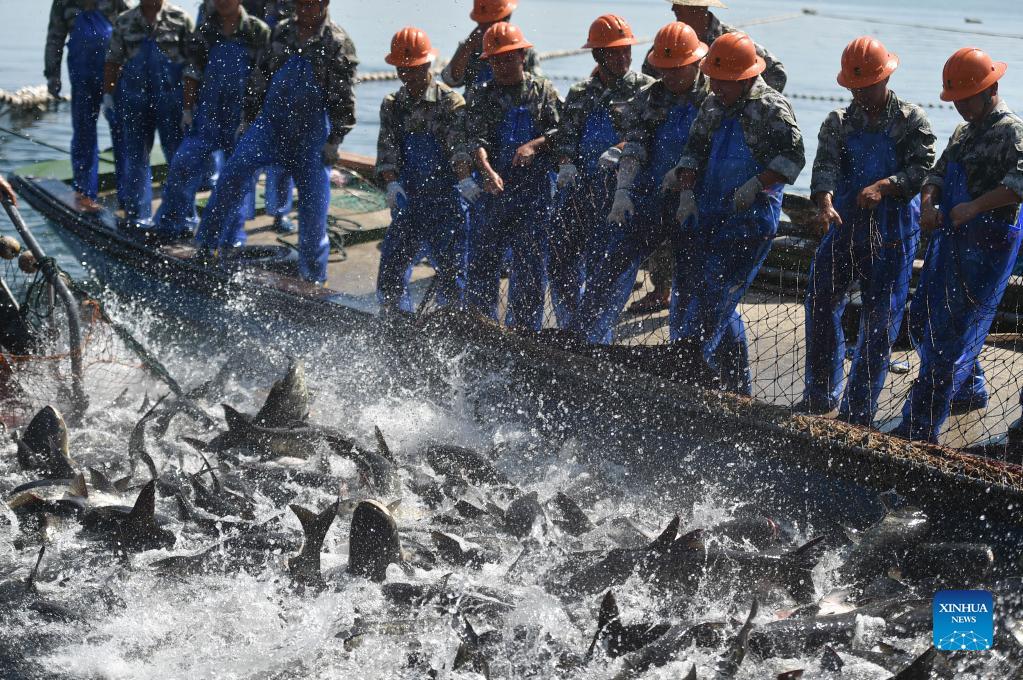 Workers harvest fishes with a huge fishing net from the Qiandao Lake in Chun'an County, east China's Zhejiang Province, Sept. 23, 2021. (Xinhua/Huang Zongzhi)