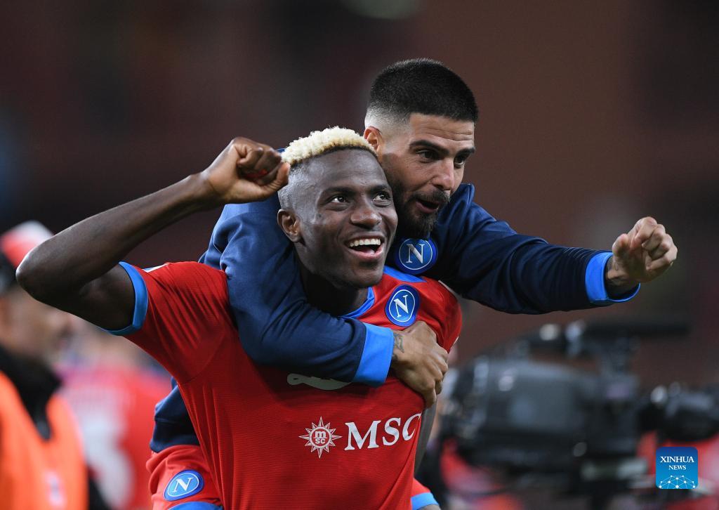 Napoli's Victor Osimhen (L) celebrates with teammate Lorenzo Insigne during a Serie A football match between Napoli and Sampdoria in Genova, Italy on Sept. 23, 2021. (Str/Xinhua)