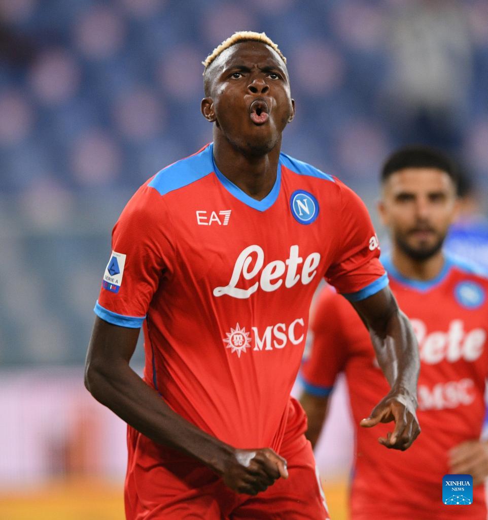 Napoli's Victor Osimhen celebrates his second goal during a Serie A football match between Napoli and Sampdoria in Genova, Italy on Sept. 23, 2021. (Str/Xinhua)