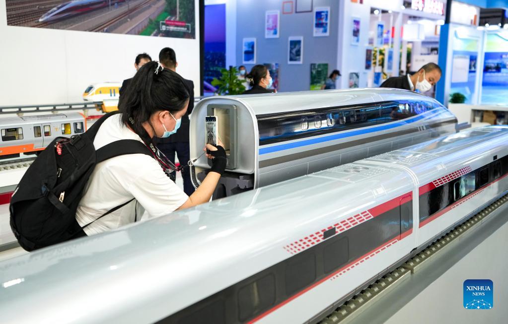 A visitor takes picture of a high-speed train model at the 13th China-Northeast Asia Expo in Changchun, northeast China's Jilin Province, on Sept. 24, 2021. The 13th China-Northeast Asia Expo is held online and offline from Sept. 23 to 27 in Changchun, capital city of northeast China's Jilin Province. (Xinhua/Xu Chang)