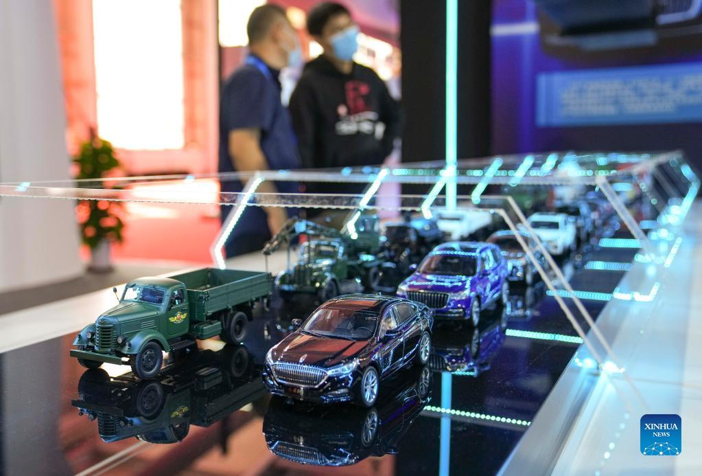 Visitor watch product models of the China First Automotive Works at the 13th China-Northeast Asia Expo in Changchun, northeast China's Jilin Province, on Sept. 24, 2021. The 13th China-Northeast Asia Expo is held online and offline from Sept. 23 to 27 in Changchun, capital city of northeast China's Jilin Province. (Xinhua/Xu Chang)