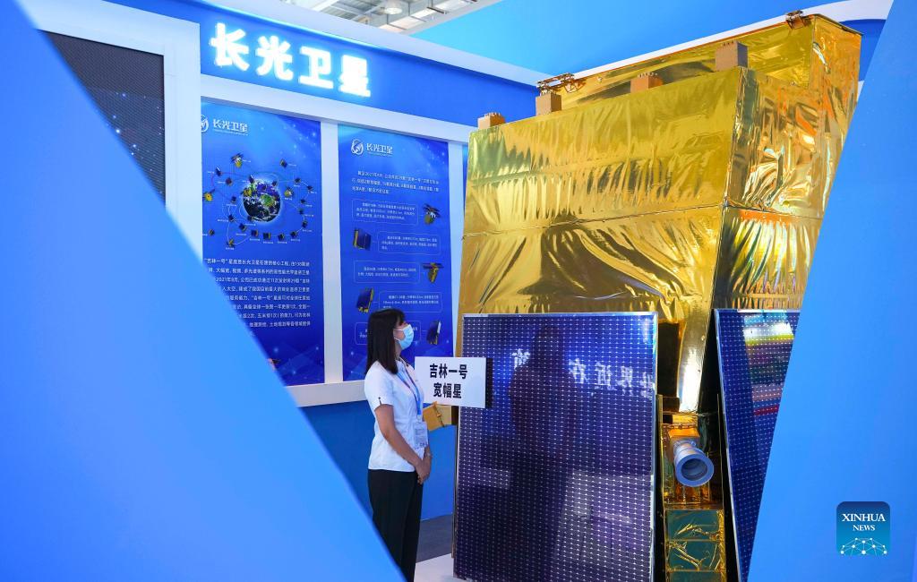 A visitor watches a real-size satellite model at the 13th China-Northeast Asia Expo in Changchun, northeast China's Jilin Province, on Sept. 24, 2021. The 13th China-Northeast Asia Expo is held online and offline from Sept. 23 to 27 in Changchun, capital city of northeast China's Jilin Province. (Xinhua/Xu Chang)