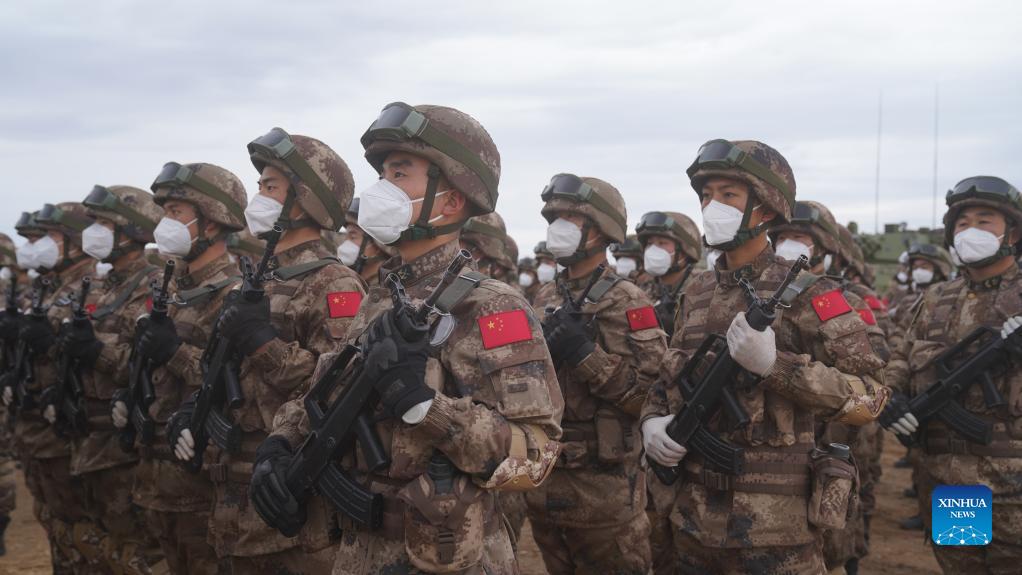 Chinese troops participate in the closing ceremony of the "Peace Mission 2021" counter-terrorism military drill of the Shanghai Cooperation Organization (SCO) member states, at the Donguz training range in Russia's Orenburg Region on Sept. 24, 2021. The "Peace Mission 2021" counter-terrorism military drill of the Shanghai Cooperation Organization (SCO) member states wrapped up on Friday in Russia. (Xinhua/Mei Shixiong)
