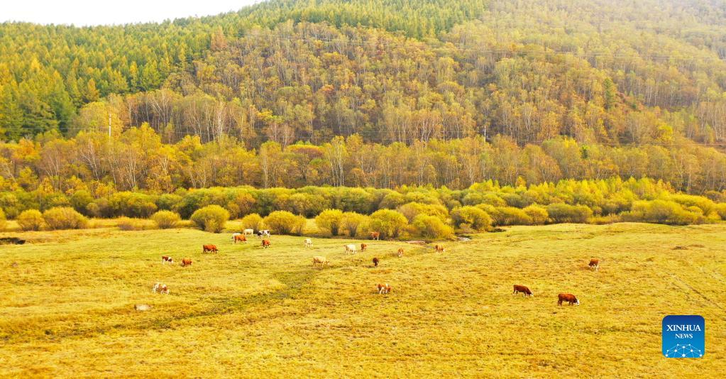 Aerial photo taken on Sept. 23, 2021 shows cattle grazing on a grassland in Saihanba forest farm in north China's Hebei Province. (Xinhua/Jin Haoyuan)