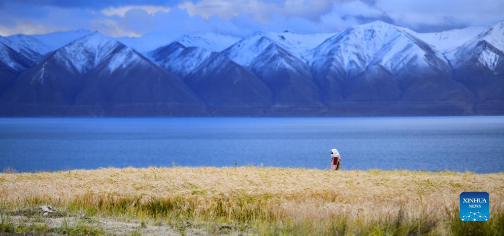 Photo taken on Sept. 23, 2021 shows ripe highland barley against the backdrop of snow-covered mountains at Ombu Township, Nyima County, Nagqu City of southwest China's Tibet Autonomous Region. In the plateau county of Nyima, the yearly average temperature stays at minus four degrees Celsius and herding is the main walk of life for most of its residents. But there is one exception -- Ombu Township where two major lakes, Tangra Yumco and Tangqung Co, help create a rare climate for farming in the grasslands. It is also a reason behind such a vast field of highland barley, rarely seen in north Tibet. (Xinhua/Jigme Dorje)