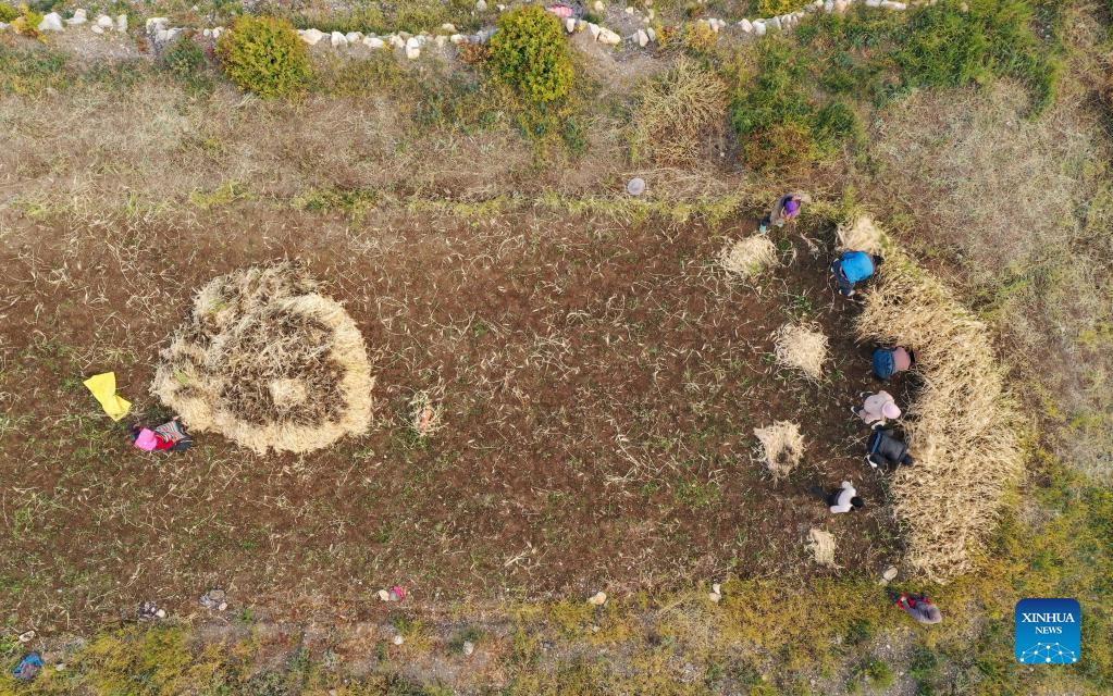 Aerial photo taken on Sept. 23, 2021 shows villagers harvesting highland barley at Ombu Township, Nyima County, Nagqu City of southwest China's Tibet Autonomous Region. In the plateau county of Nyima, the yearly average temperature stays at minus four degrees Celsius and herding is the main walk of life for most of its residents. But there is one exception -- Ombu Township where two major lakes, Tangra Yumco and Tangqung Co, help create a rare climate for farming in the grasslands. It is also a reason behind such a vast field of highland barley, rarely seen in north Tibet. (Xinhua/Jigme Dorje)