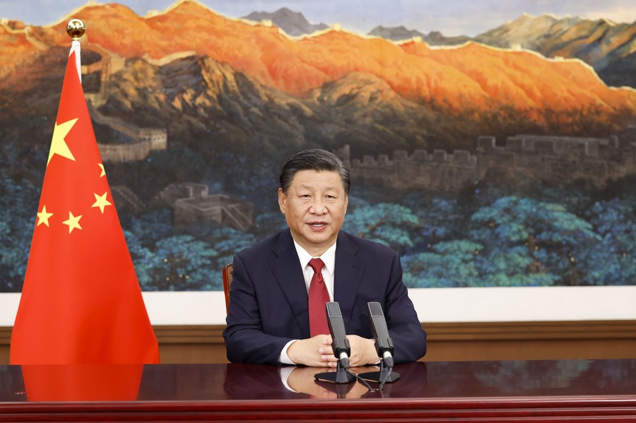 Chinese President Xi Jinping, also general secretary of the Communist Party of China Central Committee and chairman of the Central Military Commission, delivers a speech via video at the opening ceremony of the 2021 Zhongguancun Forum on Sept. 24, 2021. (Xinhua/Huang Jingwen)