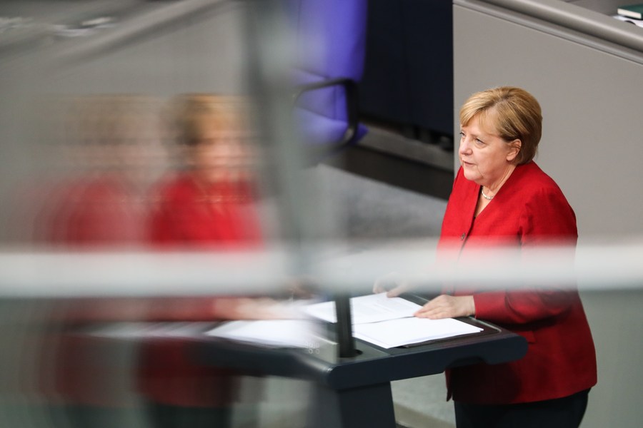 German Chancellor Angela Merkel delivers a speech on situation in Afghanistan in the Bundestag in Berlin, Germany, Aug 25, 2021. (Xinhua/Shan Yuqi)