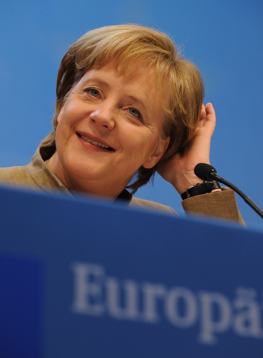 German Chancellor Angela Merkel gestures during a press conference held after the close of the two-day European Union spring summit in Brussels, capital of Belgium, March 20, 2009. (Xinhua/Wu Wei)