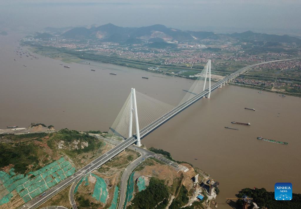 Aerial photo taken on Sept. 25, 2021 shows the Wuxue Yangtze River road bridge in central China's Hubei Province. Two new bridges over the Yangtze River opened to traffic Saturday in central China's Hubei Province. With a total length of 31 km and an 808-meter-long main span, the Wuxue Yangtze River road bridge links Wuxue City with Yangxin County of Huangshi City. The bridge has six lanes with a designed speed of 100 kph. The 11.2-km Chibi Yangtze River road bridge, with a 720-meter-long main span, shortened the vehicular travel time between Chibi City and Honghu City to five minutes. The new bridges are expected to improve the expressway network in Hubei and promote the development of urban clusters in the middle reaches of the Yangtze River. (Xinhua/Cheng Min)