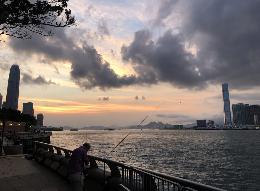 A citizen fishes on the shore of the Victoria Harbor in Hong Kong, south China, Aug. 24, 2020.(Xinhua/Li Gang)