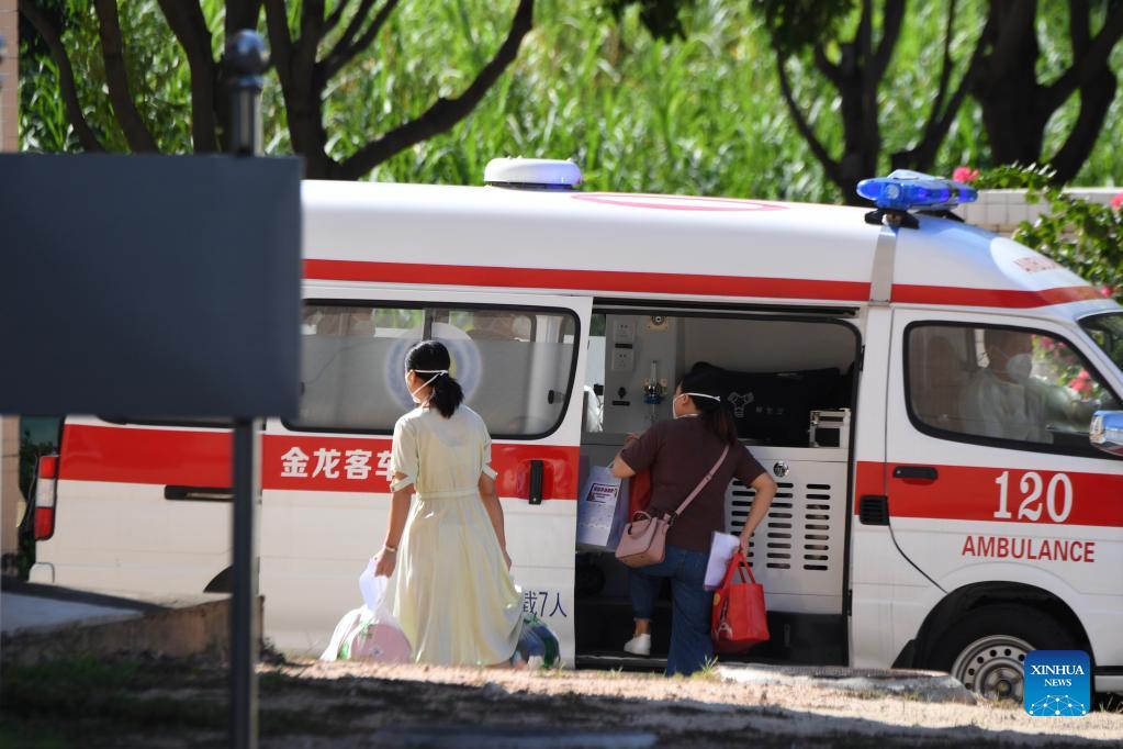 Patients recovered from COVID-19 get on an ambulance to a medical facility for rehabilitation in Xiamen, east China's Fujian Province, on Sept. 25, 2021. Seven COVID-19 patients were discharged from hospital in the city of Xiamen, east China's Fujian Province, on Saturday after recovery. This is the first batch of patients released since cluster infections of Delta variant occurred in the city earlier this month, according to local authorities. (Xinhua/Jiang Kehong)