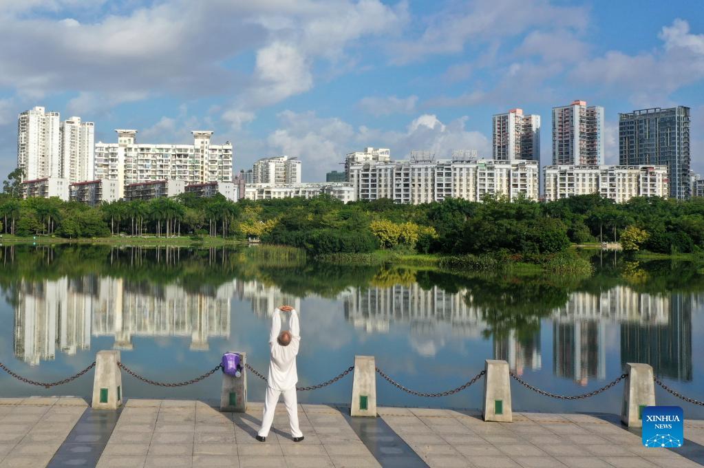 Aerial photo taken on Sept. 25, 2021 shows a citizen exercising by Nanhu Lake in Nanning, capital of south China's Guangxi Zhuang Autonomous Region. (Xinhua/Lu Boan)