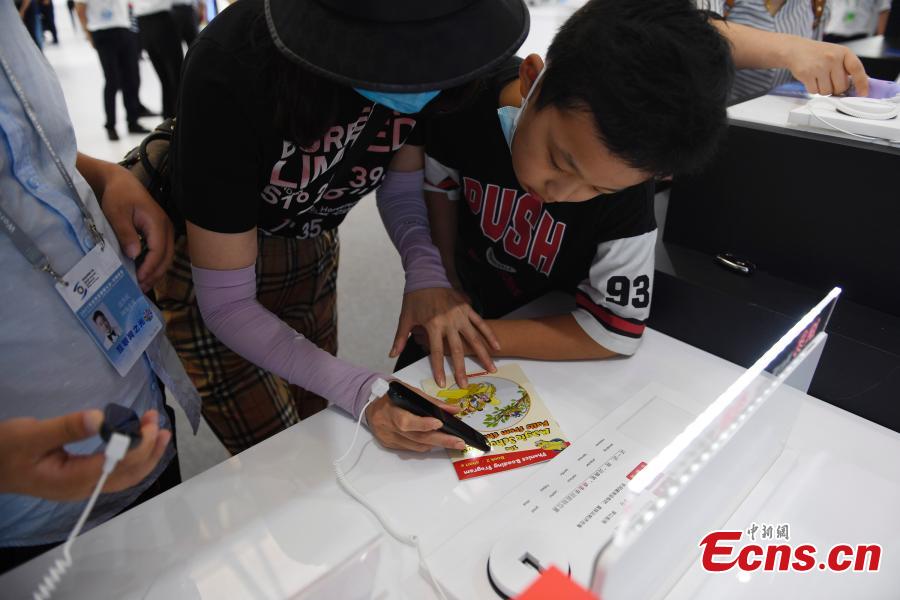 A boy and his parent try a translation pen scanner at the Light of Internet Expo of the 2021 World Internet Conference Wuzhen Summit in Wuzhen, China’s Zhejiang Province, Sept. 26, 2021. (China News Service/Xu Shaofeng)