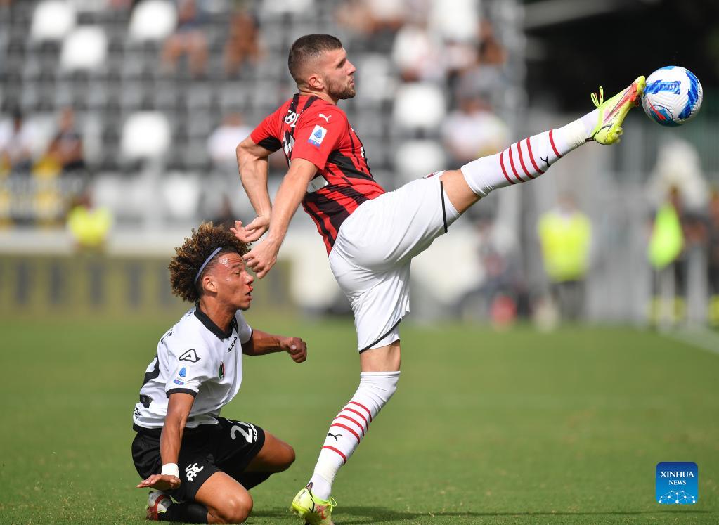 AC Milan's Ante Rebic (R) vies with Spezia's Janis Antiste during a Serie A football match between AC Milan and Spezia in La Spezia, Italy, on Sept. 25, 2021. (Photo by Daniele Mascolo/Xinhua)