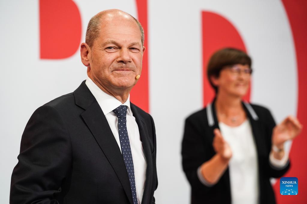 Chancellor candidate of Germany's Social Democratic Party (SPD) Olaf Scholz (L) attends a rally at the SPD headquarters in Berlin, Germany, on Sept. 26, 2021. Germany's center-left Social Democratic Party led by the incumbent Vice Chancellor and Finance Minister Olaf Scholz, won about 26 percent of the vote in the federal election on Sunday, according to the preliminary exit poll released by German media ZDF. (Photo by Stefan Zeitz/Xinhua)