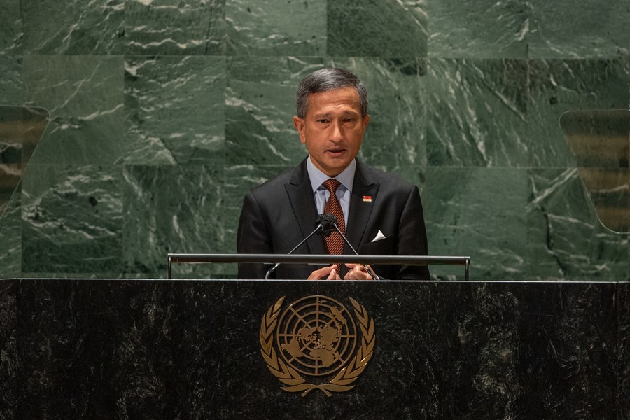 Singapore's Minister for Foreign Affairs Vivian Balakrishnan addresses the general debate of the 76th session of the United Nations General Assembly (UNGA) at the UN headquarters in New York, Sept. 25, 2021. (Cia Pak/UN Photo/Handout via Xinhua)