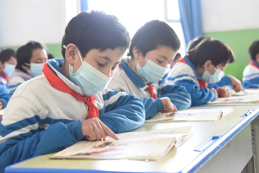 Students read textbooks at a primary school in Awat Township of Kashgar, northwest China's Xinjiang Uygur Autonomous Region, March 31, 2021. (Xinhua/Ding Lei)