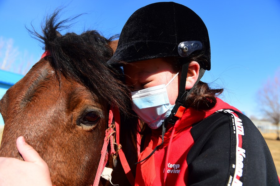 Aherke Zhuma, a seventh grade student of Oymak Boarding School, touches a horse during an equestrian class in Burqin County, northwest China's Xinjiang Uygur Autonomous Region, March 30, 2021. (Xinhua/Hou Zhaokang)