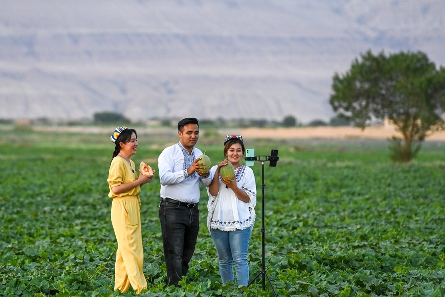 People promote Hami melons via livestreaming in Turpan of northwest China's Xinjiang Uygur Autonomous Region, May 19, 2021. (Xinhua/Ding Lei)