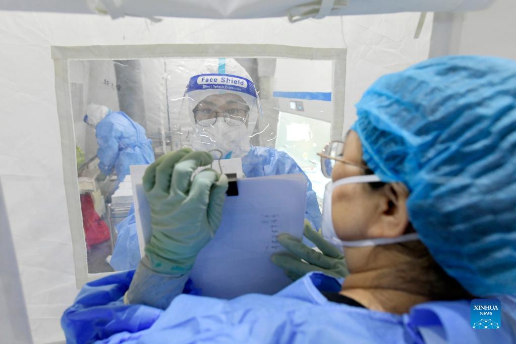 Medical workers work at a temporary lab for nucleic acid testing in Bayan County, Harbin of northeast China's Heilongjiang Province, Sept. 25, 2021. A total of three temporary labs for nucleic acid testing have been built in the county. (Xinhua/Wang Jianwei)