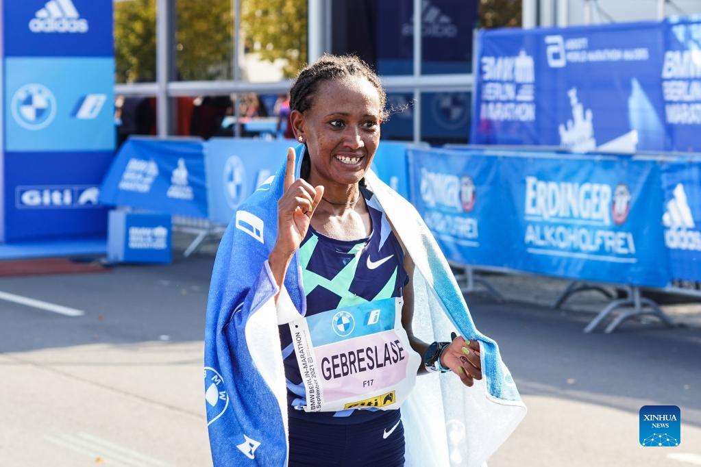 Gotytom Gebreslase of Ethiopia celebrates victory after winning the women's race of the Berlin Marathon 2021 in Berlin, capital of Germany, Sept. 26, 2021. (Photo by Stefan Zeitz/Xinhua)