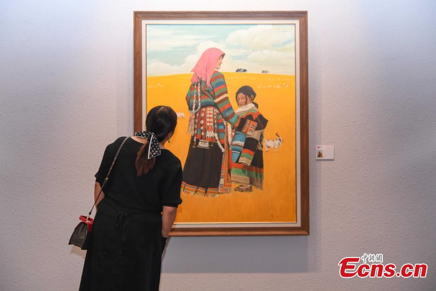A visitor appreciates a Tibet-themed painting at the Natural Science Museum in Lhasa, capital of southwest China's Tibet Autonomous Region, Sept. 26, 2021. (China News Service/Gongga Laisong)