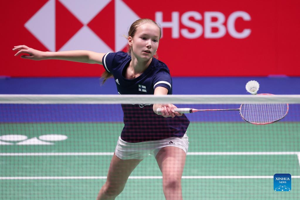 Finland's Nella Nyqvist competes against China's He Bingjiao in the women's singles competition during the group A match between China and Finland at Badminton Surdiman Cup 2021 in Vantaa, Finland, Sept. 26, 2021. (Photo by Matti Matikainen/Xinhua)