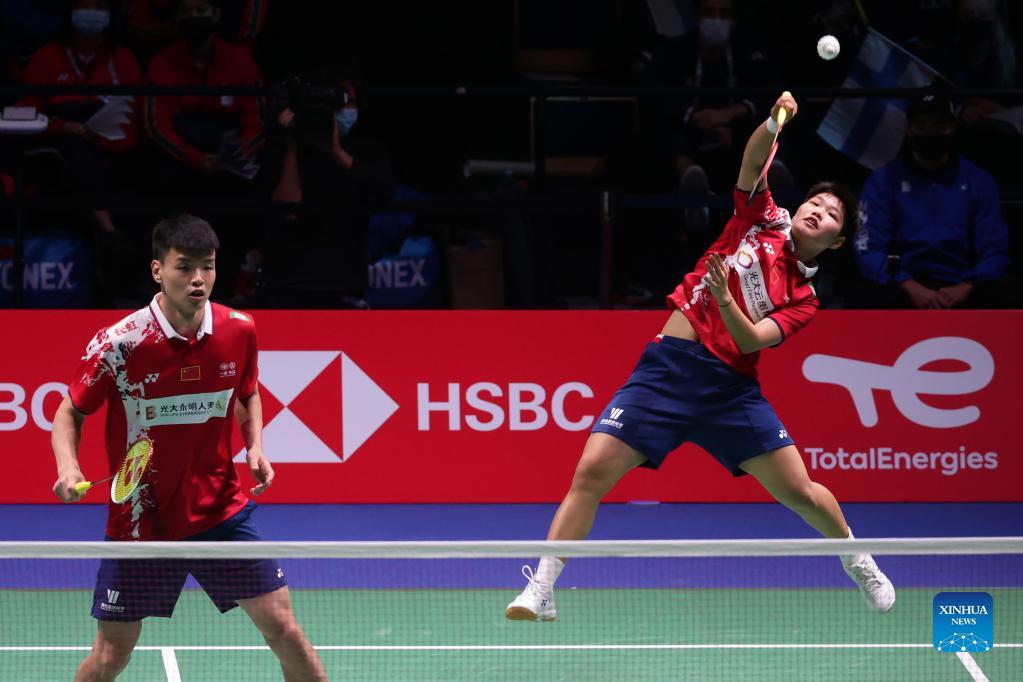 China's Wang Yilyu/Huang Dongping (R) compete against Finland's Anton Kaisti/Jenny Nystrom in their mixed doubles competition during the group A match between China and Finland at Badminton Surdiman Cup 2021 in Vantaa, Finland, Sept. 26, 2021. (Photo by Matti Matikainen/Xinhua)