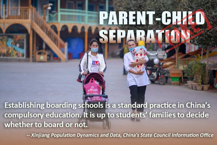 Anti-China forces have created a fabrication that Xinjiang has set up boarding schools to deal with the fallout of its massive internment campaign and seeks to preempt any possibility on the part of Uygur parents, relatives or community members to recover their children, so as to create "intergenerational separation" and "assimilate" the Uygurs.