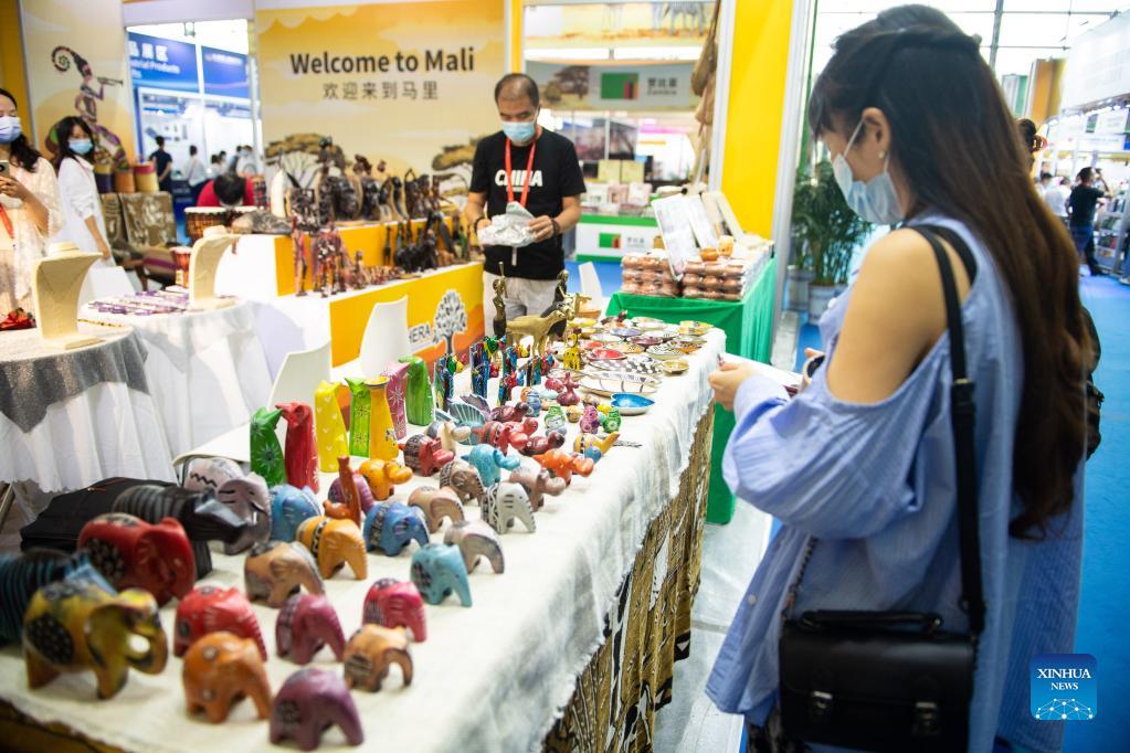 A visitor (R) selects African handicrafts during the second China-Africa Economic and Trade Expo in Changsha, capital of central China's Hunan Province, Sept. 27, 2021. The second China-Africa Economic and Trade Expo opened Sunday in Changsha. The four-day event, online and offline, has attracted nearly 900 enterprises from nearly 40 African countries and China, according to the organizers. (Xinhua/Chen Sihan)